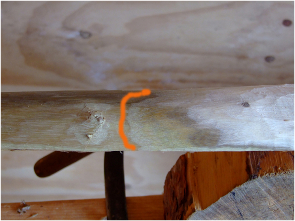 Kada smo sveli komad na dimenzije proveravamo da li osa luka ide tačno po sredini. Nije dobro da osa odstupa od sredine, pogotovo u dršci, jer prozrokuje uvrtanje luka u šaci prilikom natega i dosta utiče na bezbednost, preciznost i performanse luka. U ovom slučaju vidimo da je svaki krak za sebe prav (nema potrebe za ispravljanjem) ali da je luk kriv u jednoj tačci, u dršci i da tu mora da bude ispravljen.